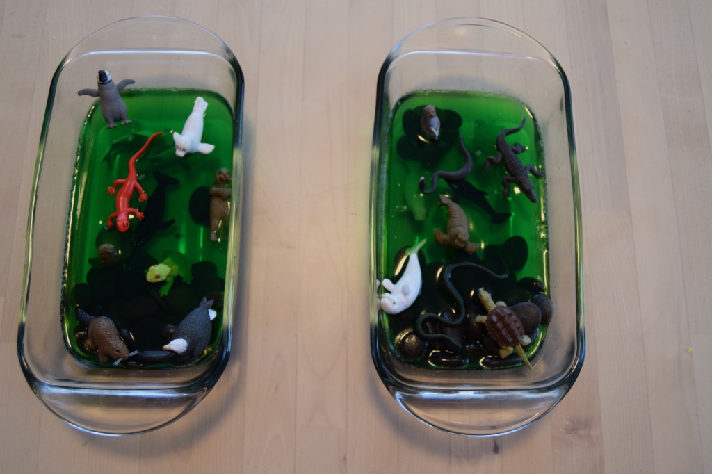 3. After Jell-O is mixed go ahead and add in your rocks and your plastic animals we chose to do a sea theme here. Unfortunately I didn’t find any blue Jell-O so we went with the next best option of green.